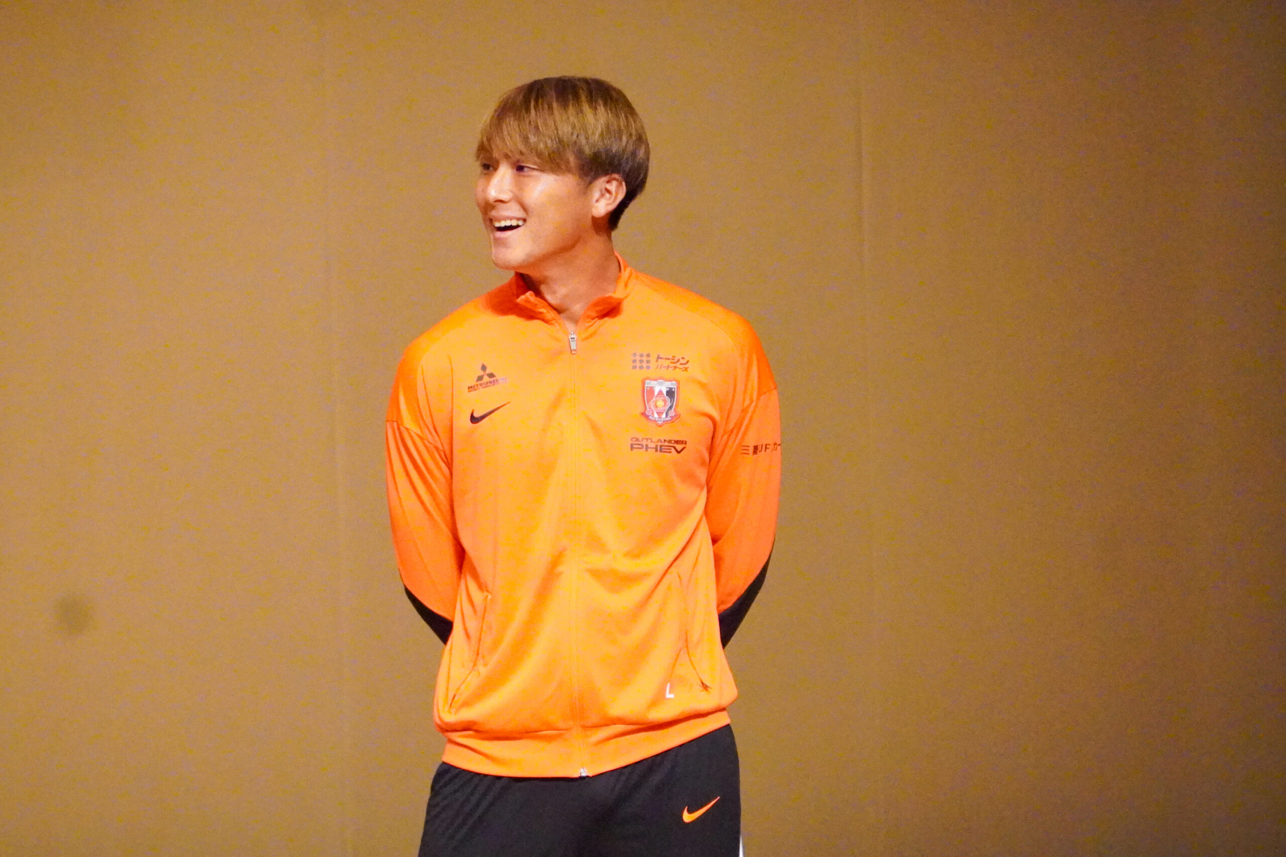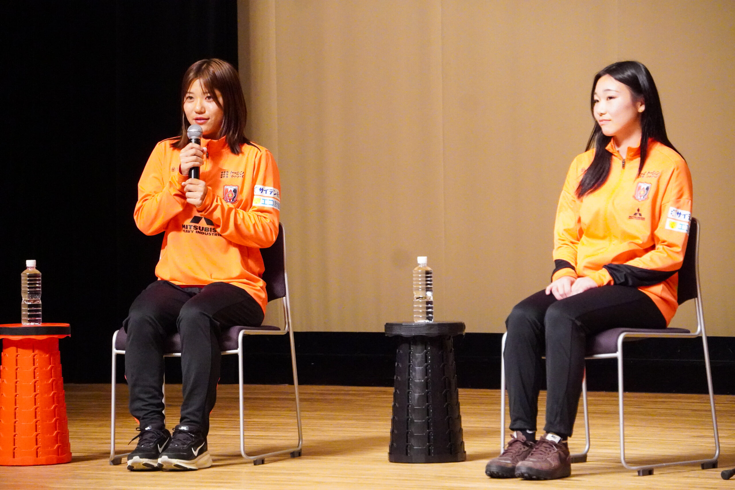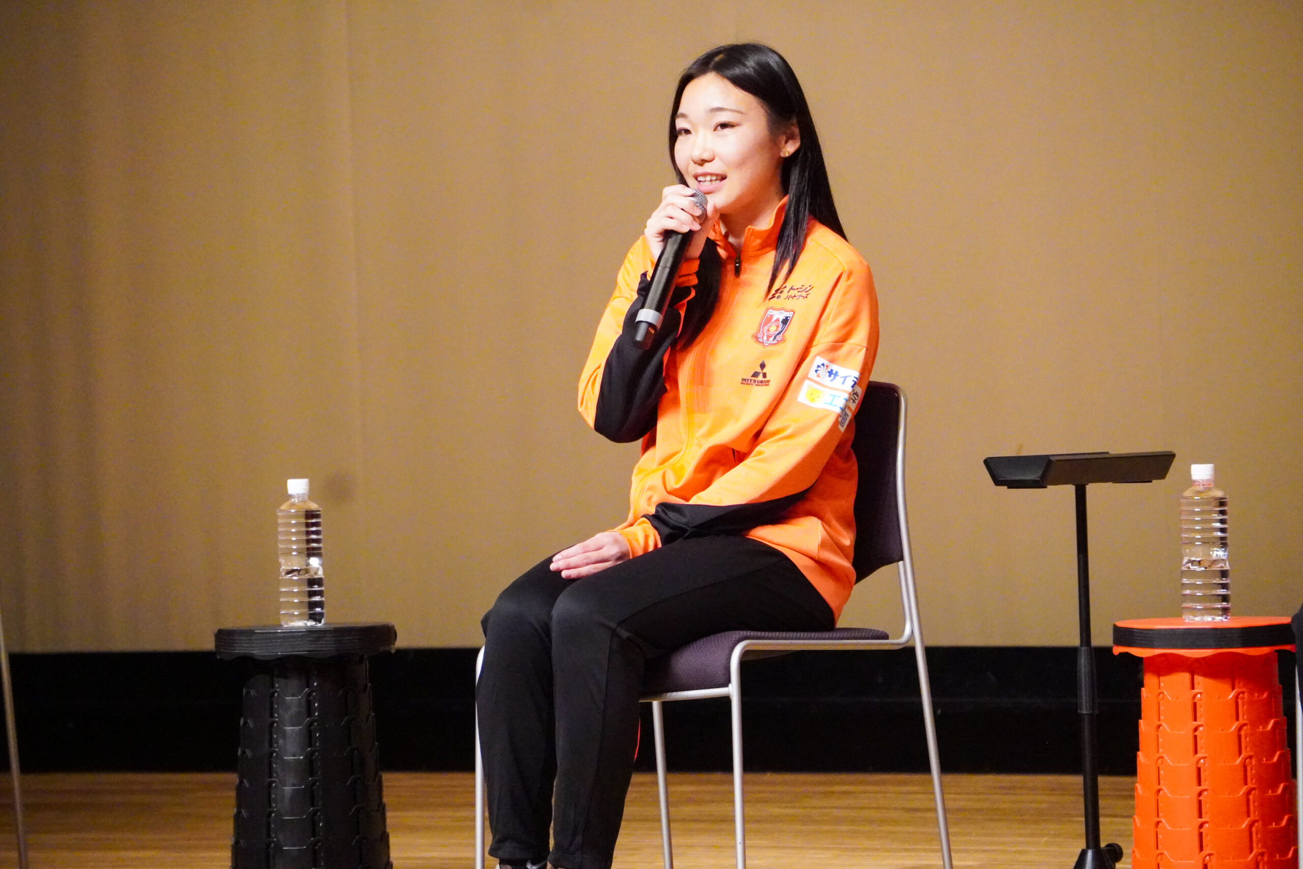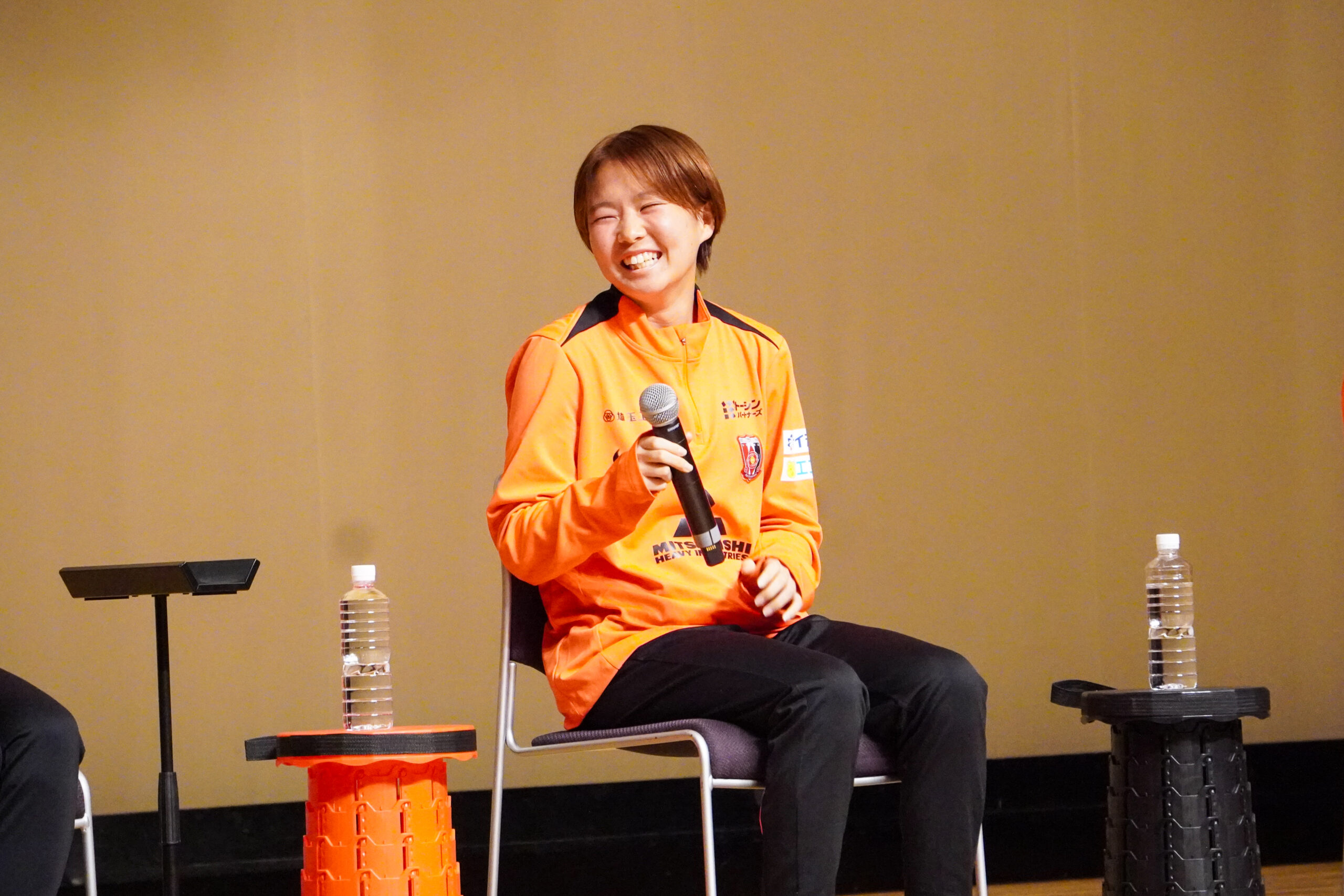 「レッズに加入して『人のためにがんばる気持ち』が成長したと思います。練習や自主練などではスタッフやチームメイトが支えてくれいますし、試合では応援してくれる人がたくさんいます。『がんばらないと』と思うことが増えましたし、誰かのために走ったり、身体を張ったりしないと、という気持ちが成長しました」と口にすると、会場からは温かい拍手が起こりました。