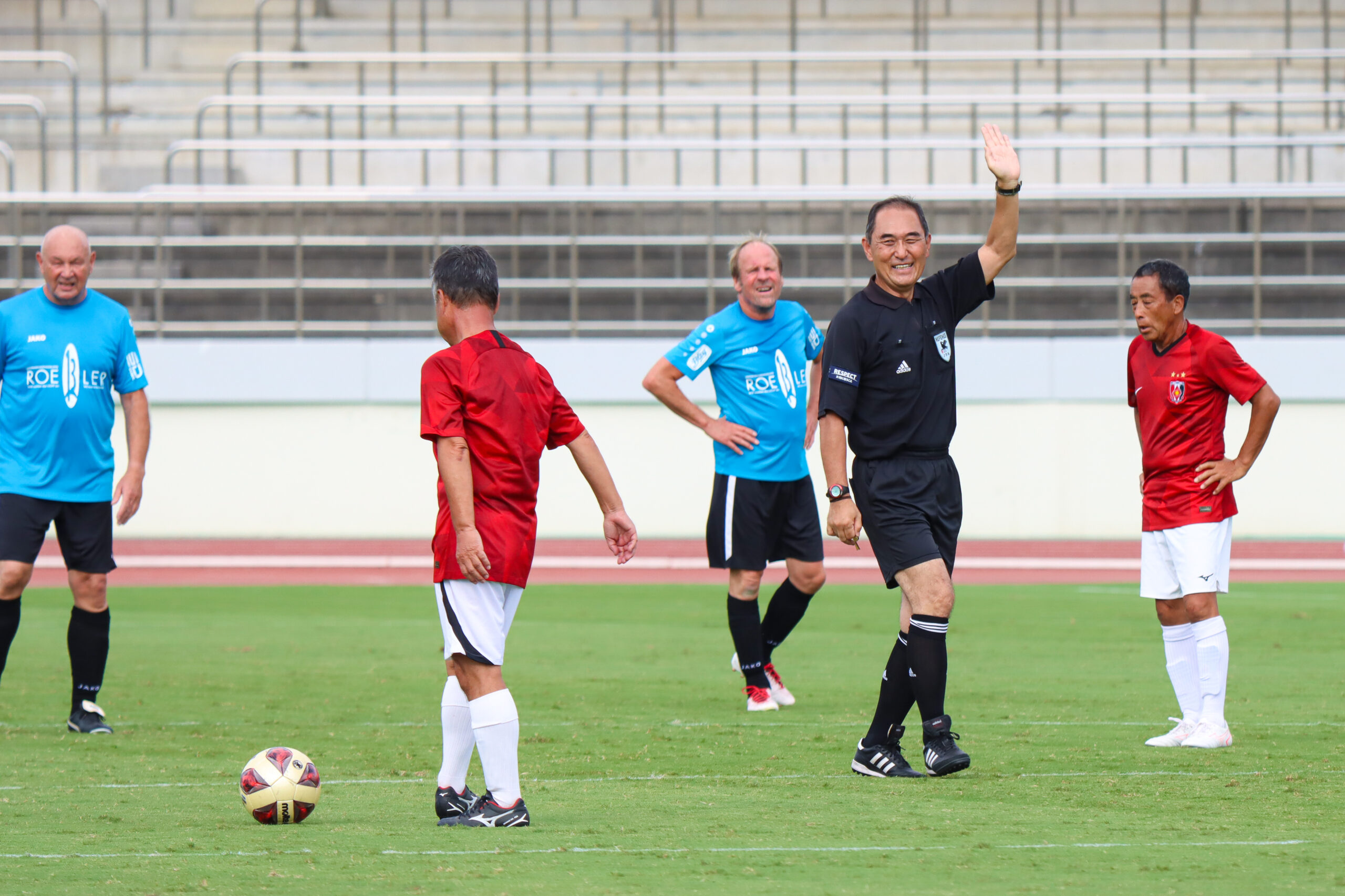 また、「今日の試合では反則がほとんどありませんでした。両チームのフェアプレーを見せていただき、本当に清々しくタイムアップの笛を吹くことができました。ありがとうございます」と岡田主審。浦和レッズ後援会の中村修三専務理事も試合を振り返って「ドイツ選抜チームはベッケンバウアーさんやマテウスさんを思い起こすプレーなども見られ素晴らしかったです。また再戦しましょう」と約束をして、懇親会は終了。最後は、名残惜しそうに両チームがハイタッチを交わしながら、「OZAKI KOJIRO MEMORIAL 第3回国際親善サッカー」の1日が締めくくられました。