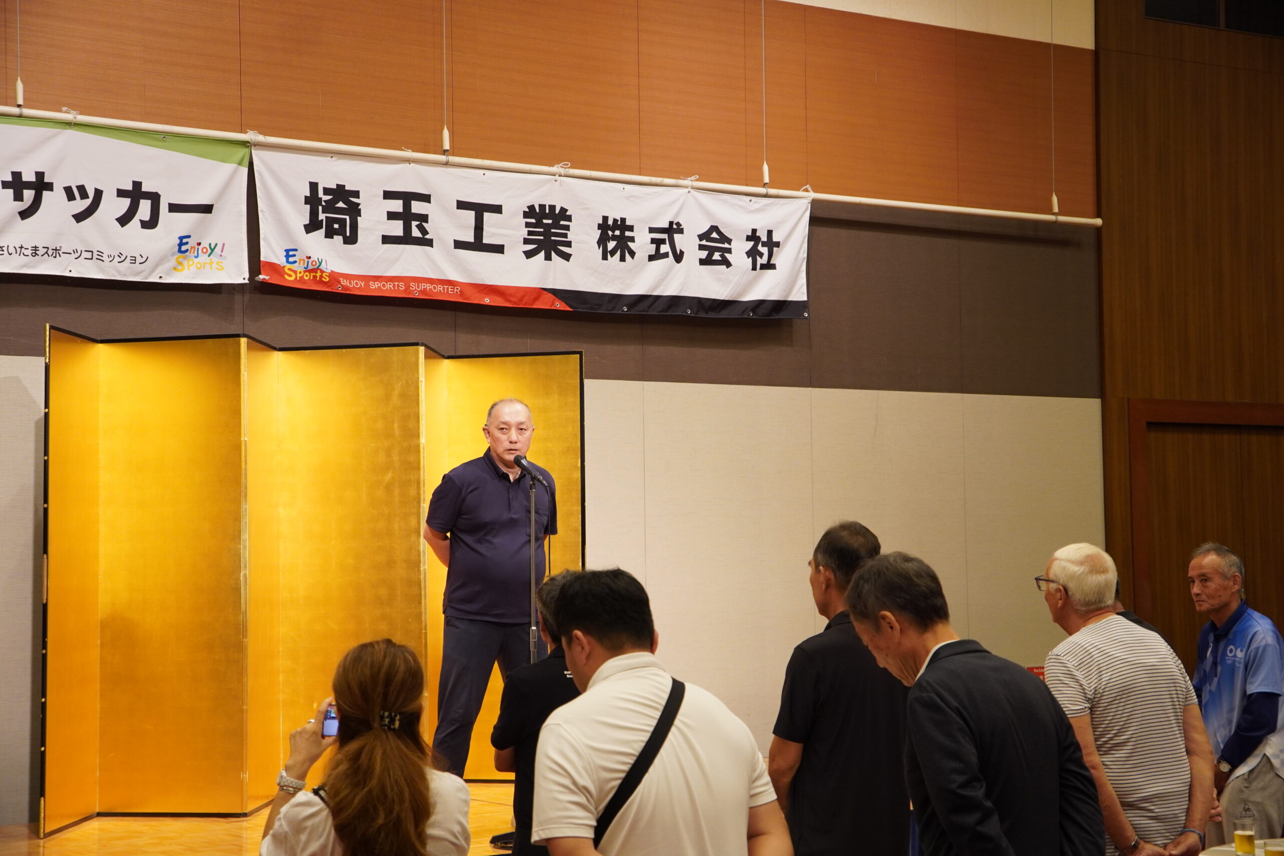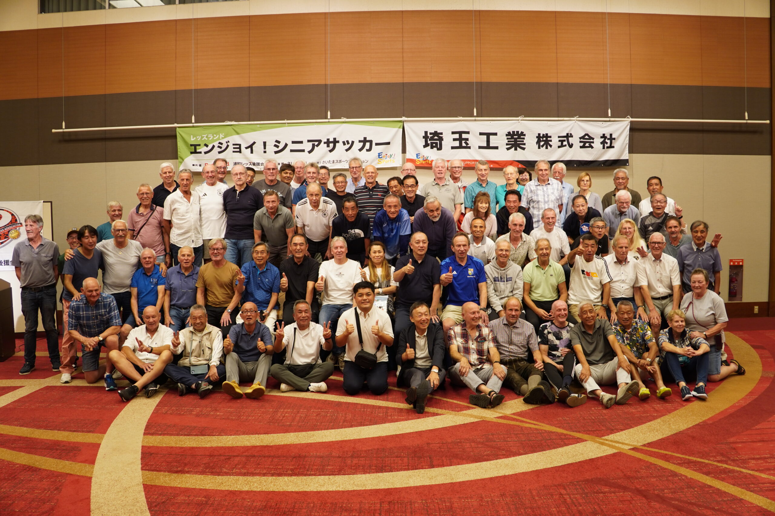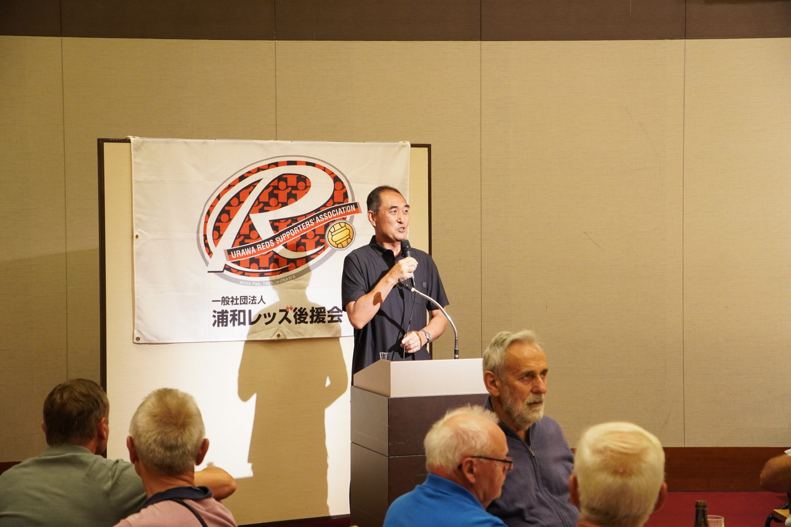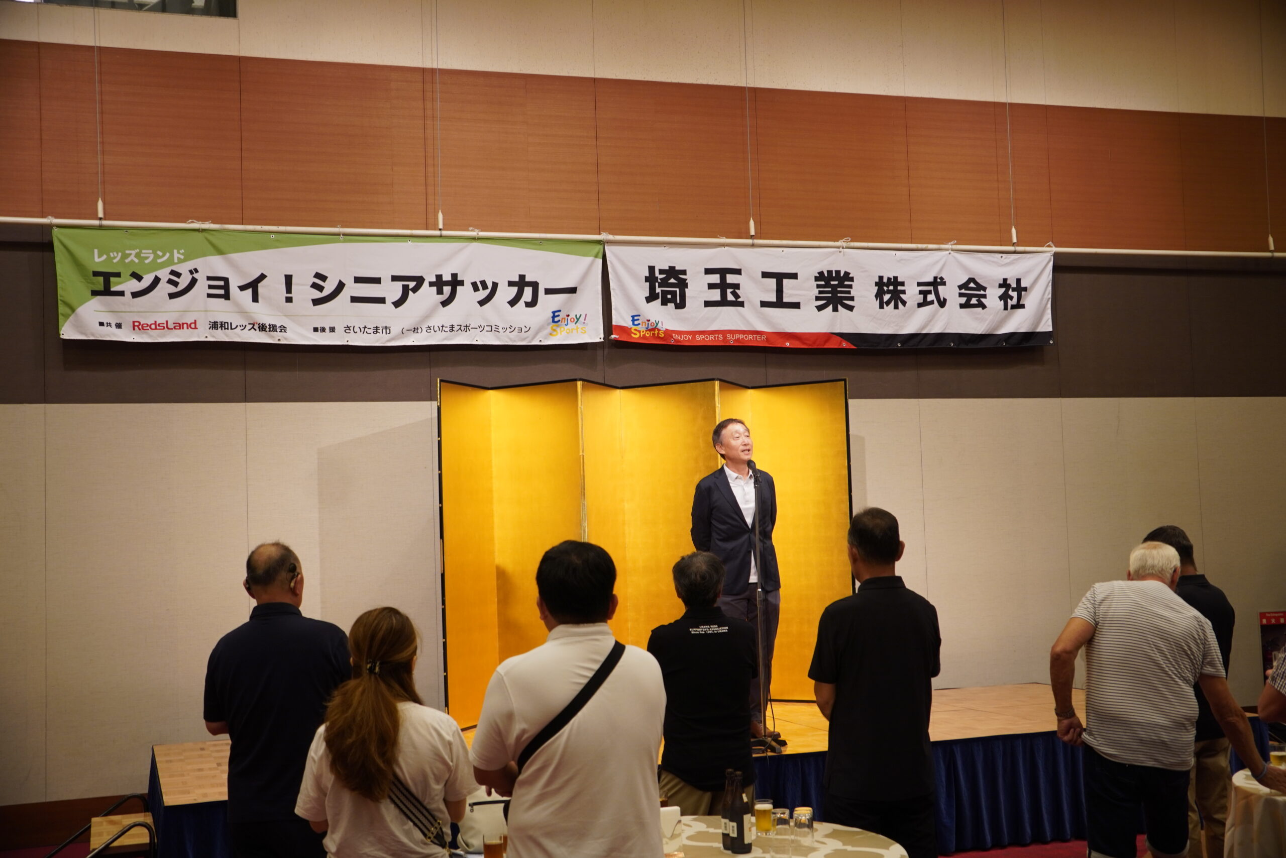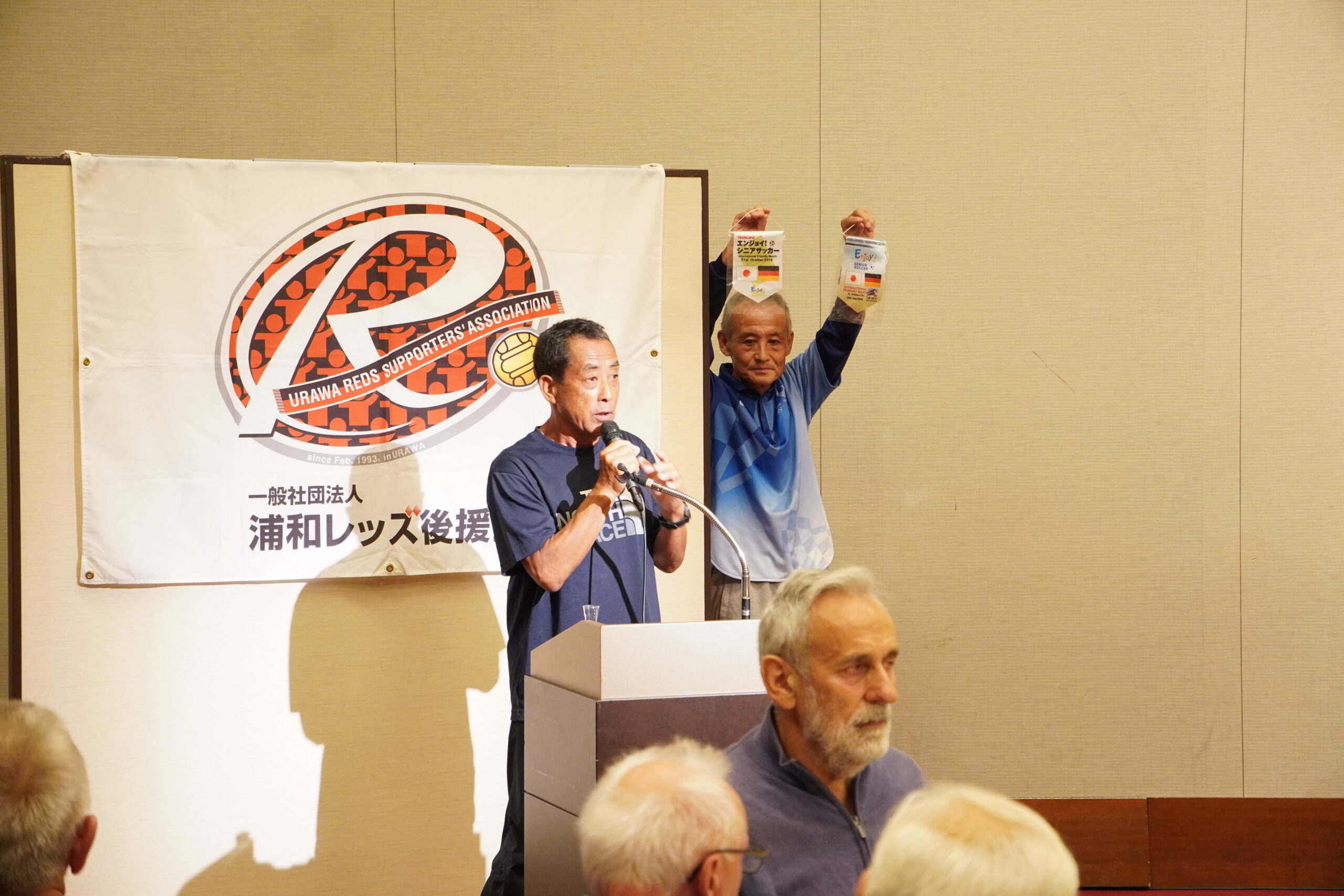 熱戦のあとは、ロイヤルパインズホテル浦和に場所を移して、立食形式の「懇親会」を開催しました。まずは浦和レッズ後援会福田知孝副理事長が登壇。「ドイツ選抜チームの皆さま、ようこそ。国際交流の機会は非常に貴重で大切です。これからもどんどん育んでいきたいと思います」という挨拶に続いて、協賛社として今大会を支えた埼玉工業・尾﨑和男社長から「ドイツ選抜チームのみなさん、浦和レッズ後援会シニアチームの皆さん。本日は熱戦お疲れ様でした。『OZAKI KOJIRO MEMORIAL 第3回国際親善サッカー』の開催を大変うれしく思います。今後もこの交流が続いていくことを心より願っております」と、言葉が贈られました。
