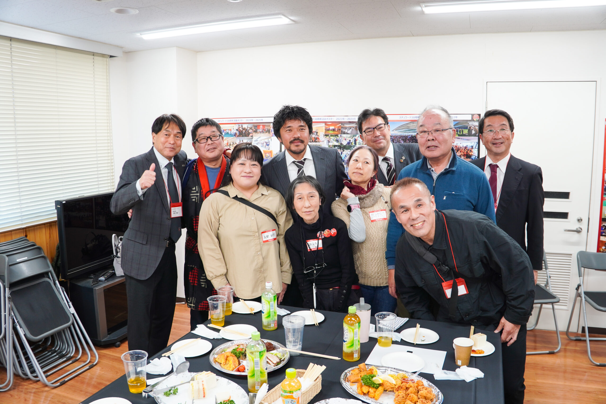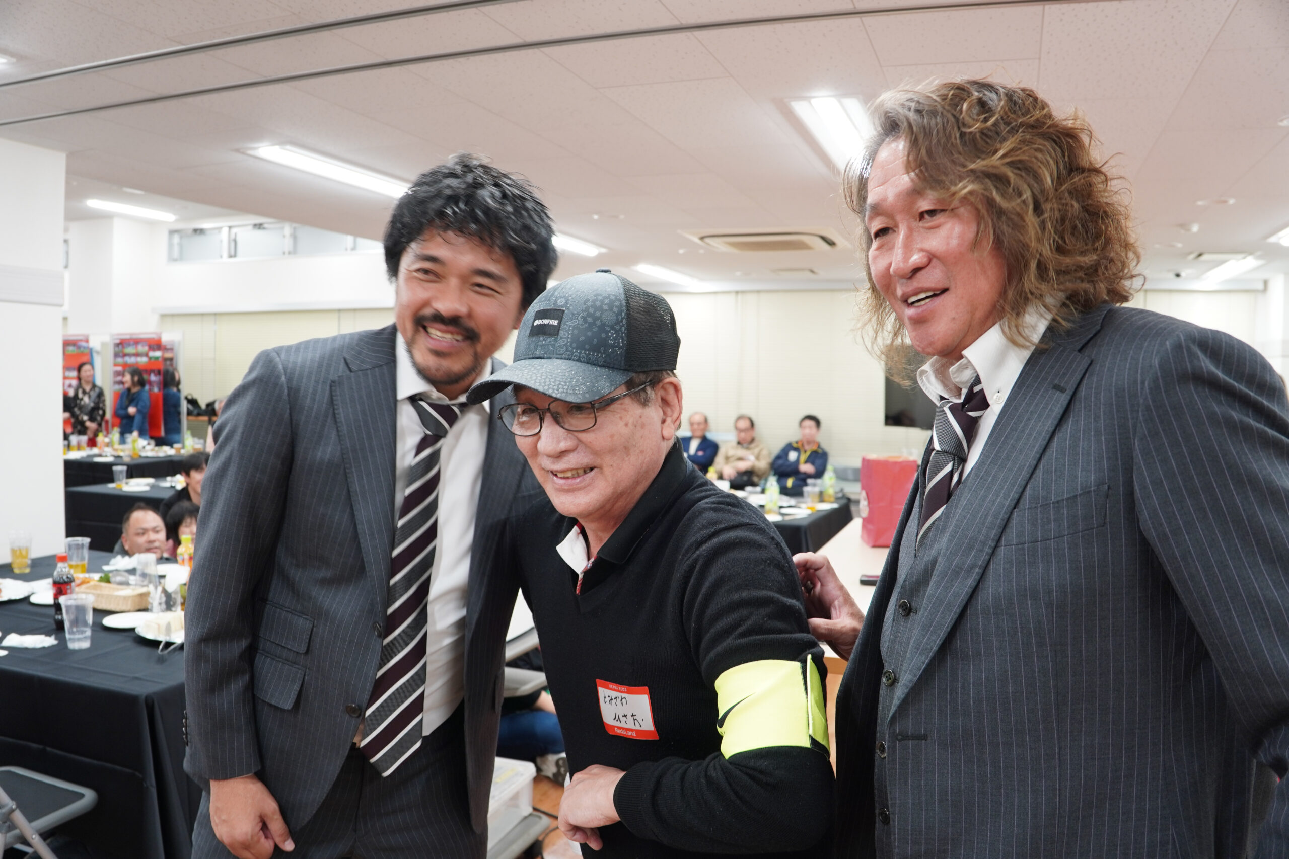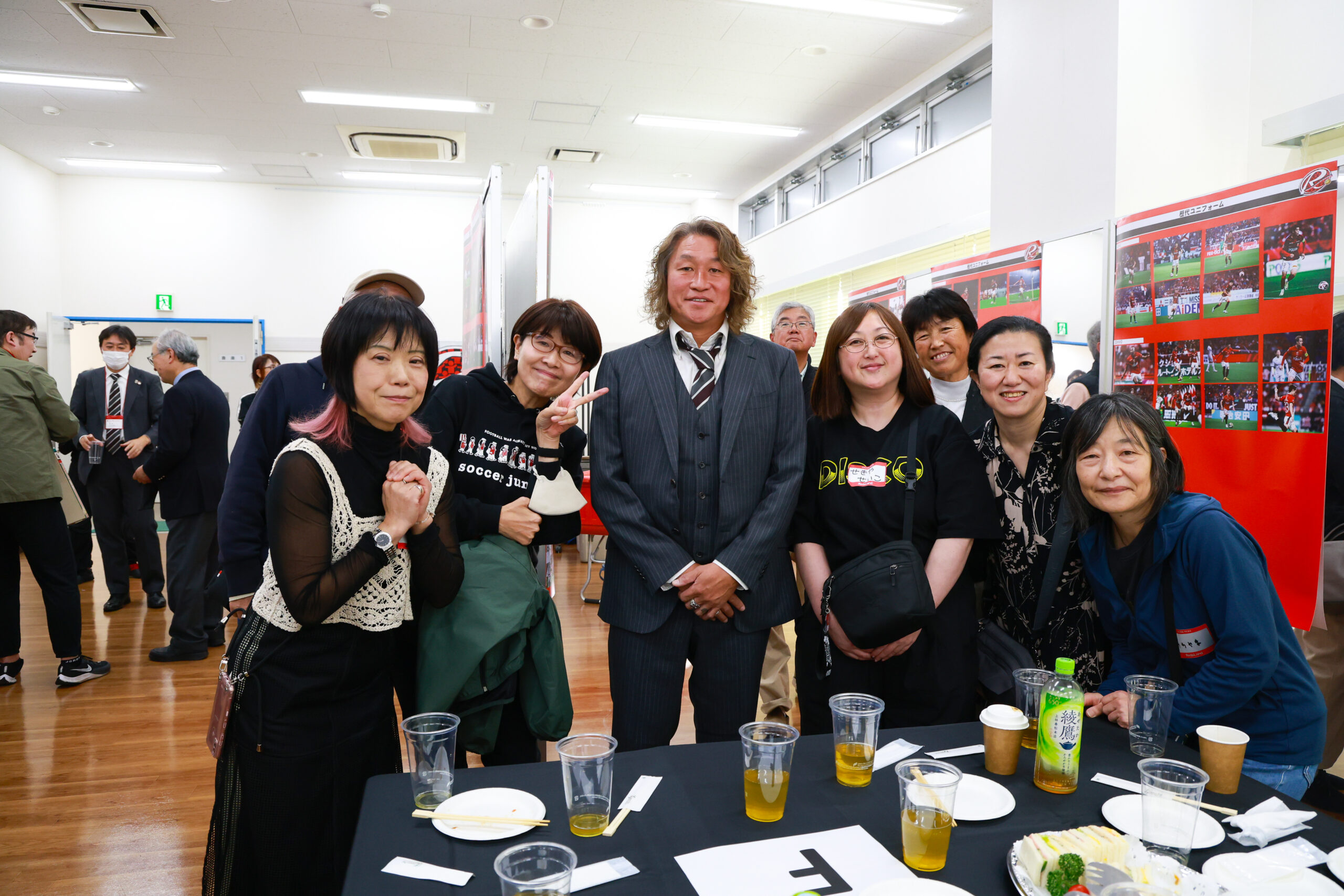 質疑応答を終えた山本さんによる乾杯の音頭で、スチュワード30周年記念イベントはしばしの歓談タイムへ。ここで登場したのはスペシャルゲストの岡野雅行レッズ・ブランドアンバサダーとクラブOBの興梠慎三さんです。
