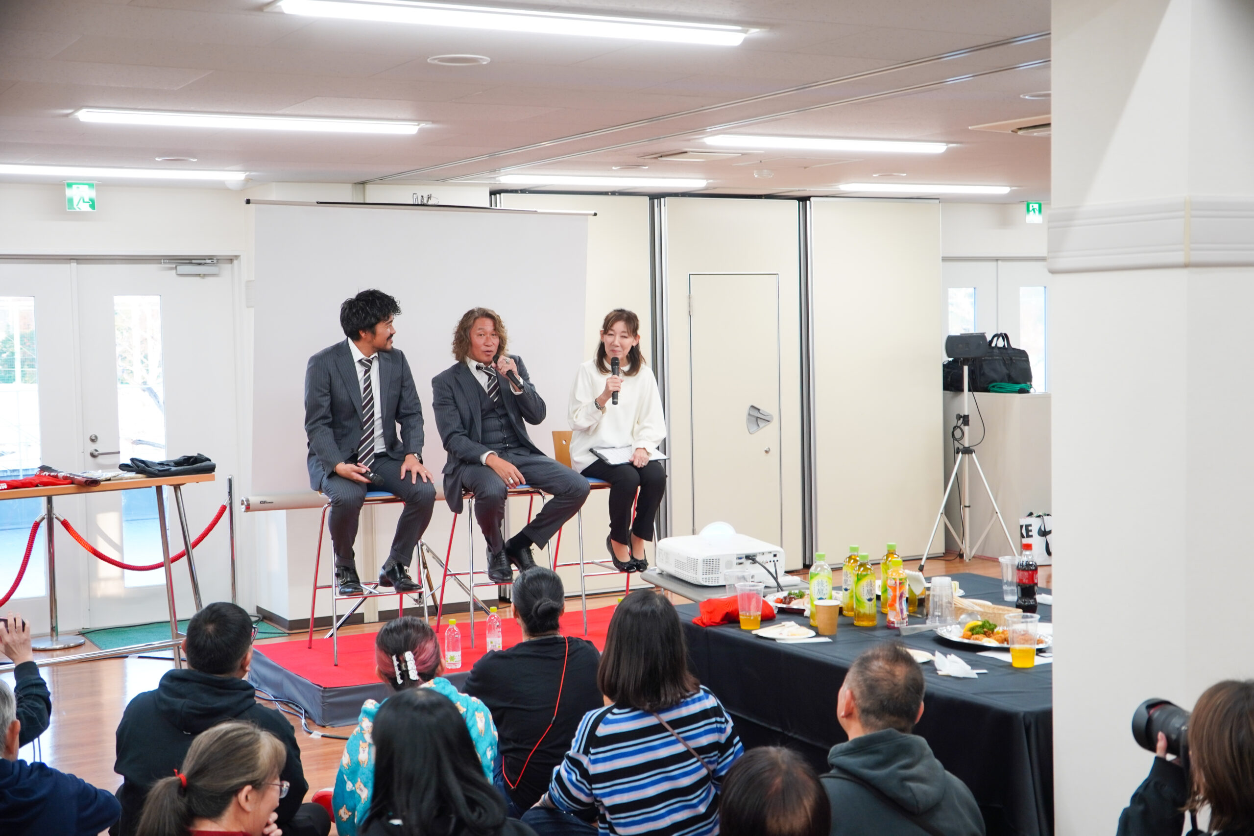 興梠さんはスチュワード体験を行ったときにことに触れ「選手時代にはわからなかったことをたくさん知る時間でした。今も若手選手はスチュワード体験をしたほうがいいと伝えています。やっぱり選手がピッチで伸び伸び試合をできるのは、みなさんのおかげ。いろいろな事情があって、体験時は試合前までしかできなかったんですけど、変装してもいいから続けたいと言ったほどでした」というエピソードに加え、12月13日(土)に行われる自身の引退試合でも「(引退試合でも)スチュワードのみなさまが活動してくれると聞いています。おいしいお弁当を用意しますので、よろしくお願いします!(笑)」と一礼をすると、スチュワードのみなさまからも大歓声が起こりました。